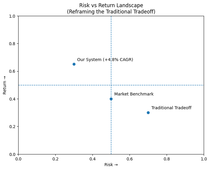 | Drawdown Reduction | 48% less pain (not just higher returns) |